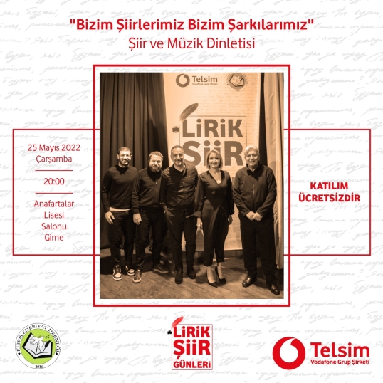 Dernekten yapılan açıklamaya göre, Telsim ana sponsorluğunda çıktığı 10’uncu yıl turne programı kapsamında Girne Anafartalar Lisesi Salonu’nda sahne alacak Lirik Şiir Grubu, “Bizim Şiirlerimiz-Bizim Şarkılarımız” başlıklı etkinlikte, Filiz Naldöven şiirleri de okuyacak.