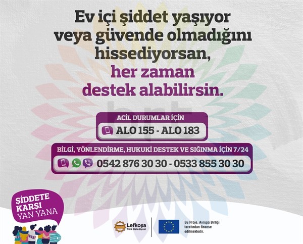 “Sosyo-ekonomik durum, yaşadığı bölge, cinsel yönelim veya cinsiyet kimliği, vatandaşlık veya muhaceret durumu gibi hiçbir ayrım gözetilmeksizin her türlü bilgilendirme, yönlendirme, adli yardım ve sığınma talepleri için Lefkoşa Türk Belediyesi Aile İçi Şiddetle Mücadele Ekibi’ne 0542 876 30 30 ve 0533 855 30 30 numaralı telefonlardan 7/24 ulaşabilirsiniz”