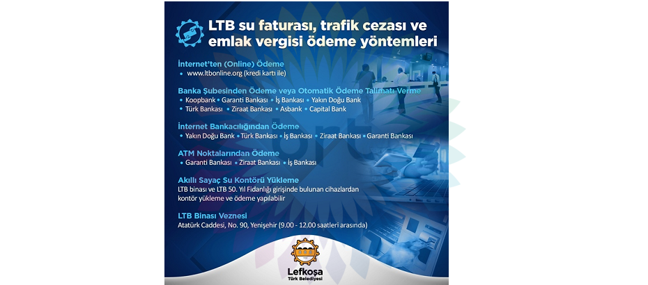 Garanti Bankası, İş Bankası ve Ziraat Bankası ATM Noktalarından da ödeme yapılabileceği belirtilen açıklamada, akıllı sayaç su kontürü yükleme ve ödemenin ise LTB binası, LTB 50. Yıl Fidanlığı ve Hamitköy’de bulunan cihazlardan yapılabileceği kaydedildi.