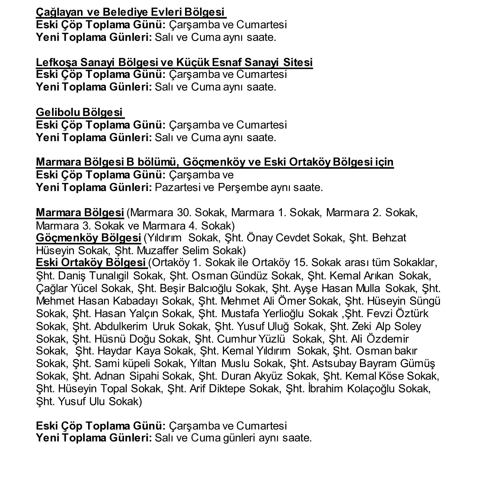 Lefkoşa Türk Belediyesi (LTB) 11 Eylül’ü 12 Eylül’e bağlayan gece yarısından itibaren geçerli olmak üzere, evsel atık toplama günlerinde yeniden düzenleme yapıldığını açıkladı.