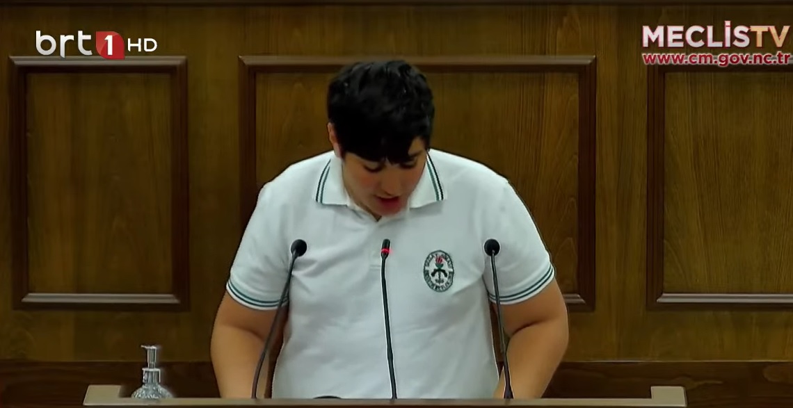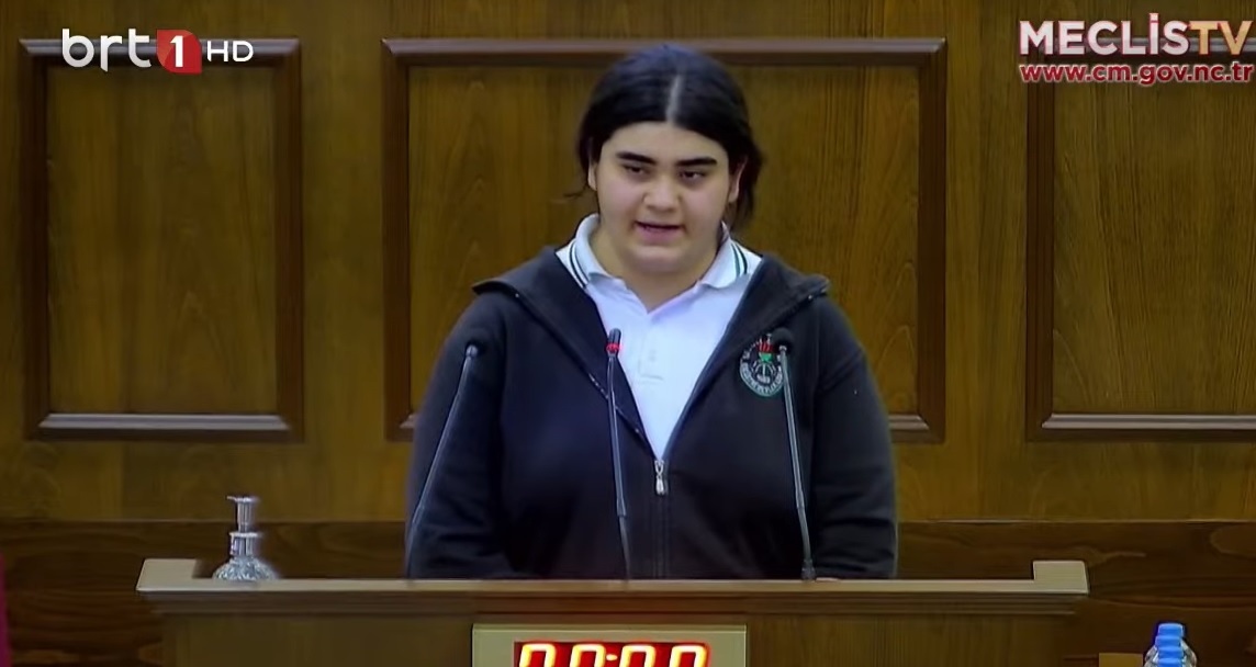 Öğrenciler daha sonra sırasıyla söz aldı. İlk sözü alan İlayda Kaya, Kurucu Cumhurbaşkanı Rauf Denktaş’la özdeşleşmiş olan “Benim İki Bayrağım Var” şiirini okudu.