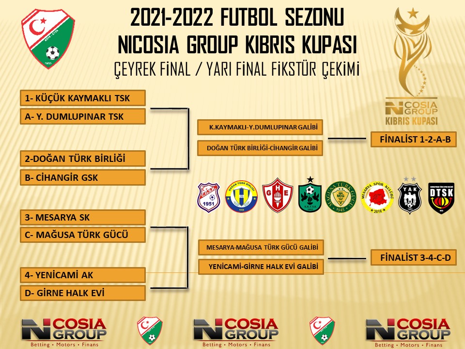 Küçük Kaymaklı – Yonpaş Dumlupınar, Mesarya – Mağusa Türk Gücü, Yenicami – Girne Halk Evi, Doğan Türk Birliği – Cihangir. Çeyrek final çift maç eleme usulüyle oynanacak. Bu arada aynı kura çekiminde yarı final eşleşmeleri de belirlendi. Buna göre yarı finalde, Küçük Kaymaklı-Yonpaş Dumlupınar’ın galibiyle Doğan Türk Birliği-Cihangir’in galibi eşleşti. Diğer taraftan ise Mesarya-Mağusa Türk Gücü’nün galibiyle Yenicami-Girne Halk Evi’nin galibi eşleşti.