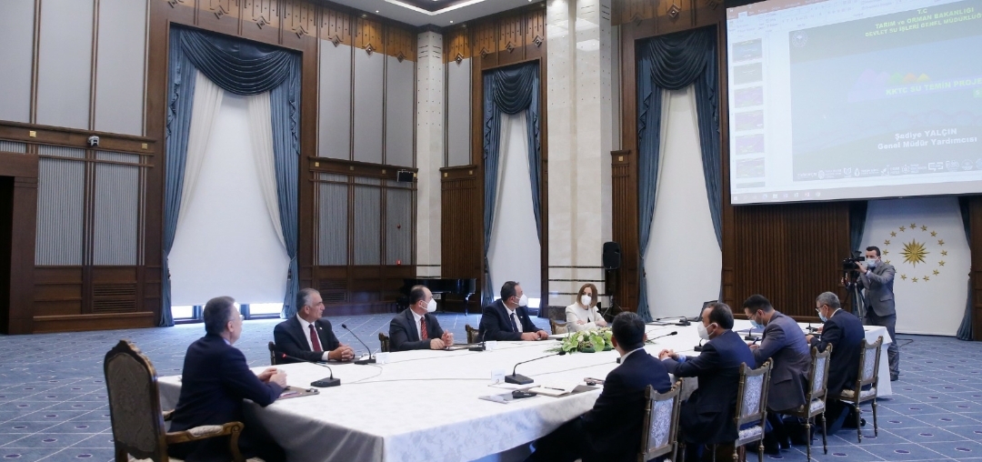 Cumhurbaşkanlığı Külliyesi’nde gerçekleşen toplantıda, KKTC su temin projesi kapsamında iletim tüneli, Güzelyurt ve Mesarya ovaları sulama çalışmalarıyla, halihazırda devam eden ve biten projelere ilişkin konular ele alındı.