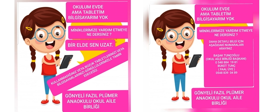 Açıklamada, “miniklerimizin bir kısmının uzaktan eğitime katılım için imkanı yok. El ele verelim tüm miniklerimize imkan yaratalım. Evinizdeki kullanmadığınız tabletleri bize verin. Bozuk tablet ve bilgisayarları gönüllülerimize tamir ettirelim. Topladığımız tablet – bilgisayar ve laptopları ihtiyaçlı olan çocuklarımıza uzaktan eğitim çalışmaları boyunca verip sonra tekrar okulumuzda toplayacağız. El birliği ile başarabiliriz destekleriniz önemli”denildi.