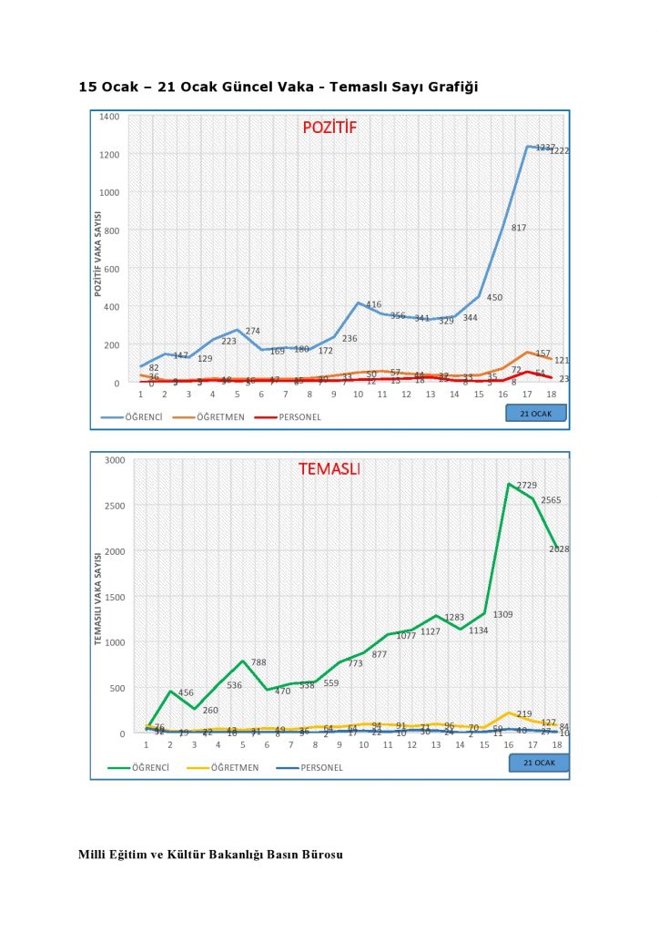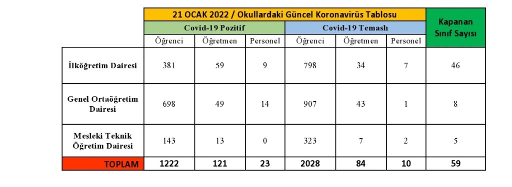 Buna göre, İlköğretim, Genel Orta Öğretim ve Mesleki Teknik Öğretim Dairesine bağlı okullarda bin 222 öğrenci, 222 öğretmen ve 23 personelin pozitif olduğu, toplam 2 bin 28 öğrenci, 84 öğretmen ve 10 personelin temaslı kategorisinde olduğu kaydedildi.
