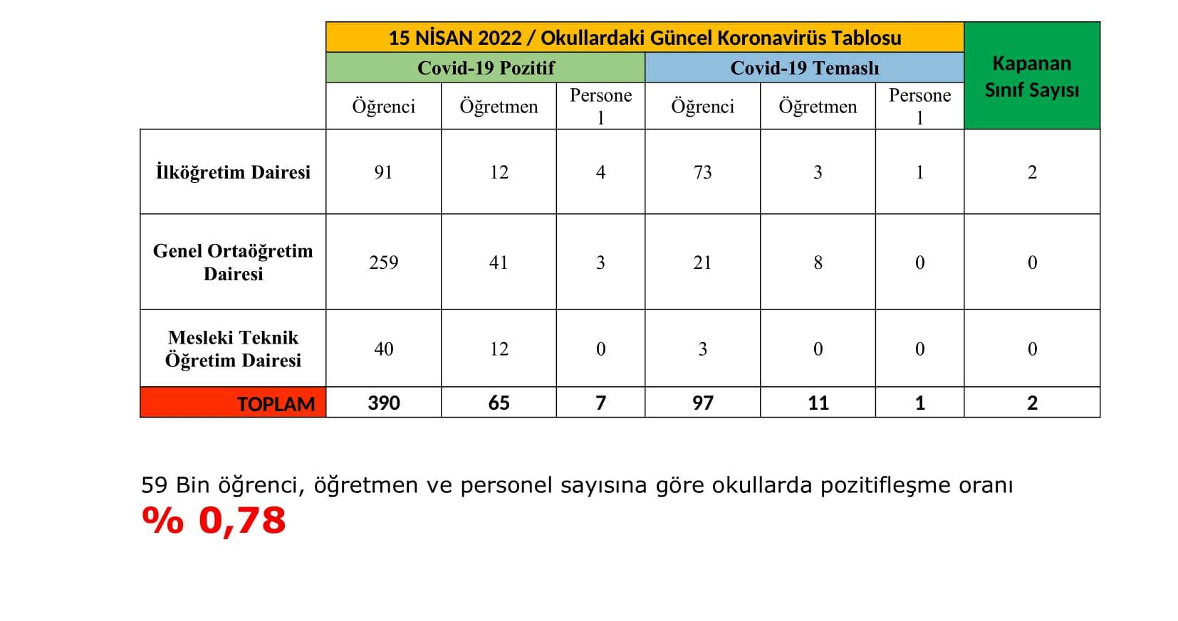 59 bin öğrenci, öğretmen ve personel sayısına göre okullarda pozitifleşme oranı yüzde 0,78 olarak gerçekleşti.