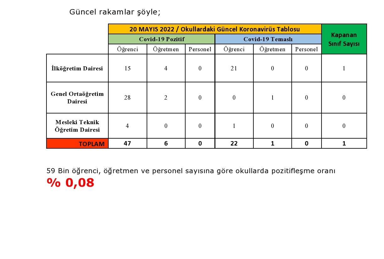 Açiklamaya göre, okullarda 47 öğrenci ve 6 öğretmenin kovid-19 testi pozitif çıkarken, 22 öğrenci ve 1 öğretmen temaslı oldu, 1 sınıf ise kapandı.