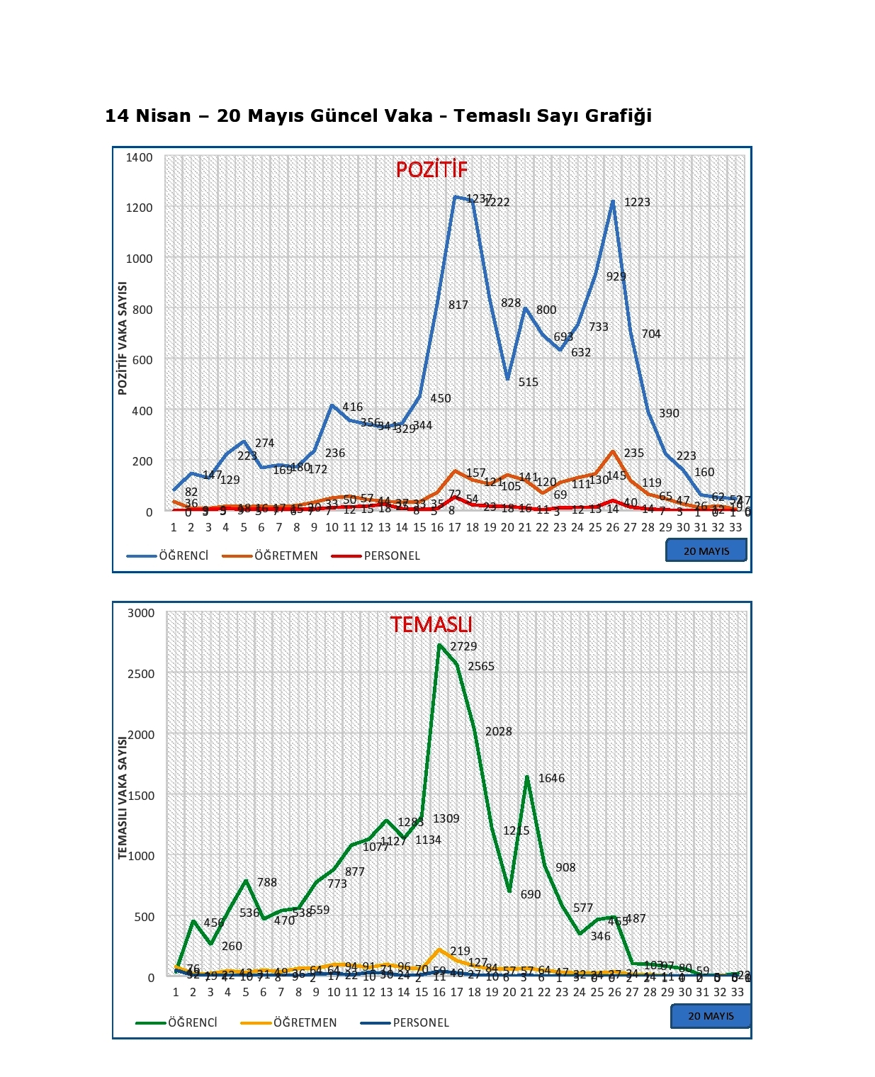 İlkokullarda 15 öğrenci ile 4 öğretmen pozitif, 21 öğrenci temaslı; ortaokul ve liselerde 28 öğrenci ile 2 öğretmen pozitif, 1 öğretmen temaslı ve meslek okullarında ise 4 öğrenci pozitif, 1 öğrenci temaslı oldu.