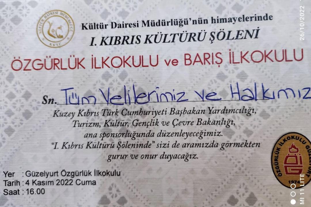 Özgürlük ve Barış ilkokulları, Başbakan Yardımcılığı, Turizm Kültür Gençlik ve Çevre Bakanlığı sponsorluğunda, Kültür Dairesi Müdürlüğü himayelerinde 1. Kıbrıs Kültür Şöleni düzenliyor.