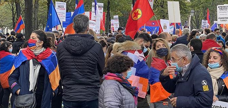 Terör örgütü PKK yandaşları da ellerinde Ermenistan bayrağı ve örgüte ait bez parçalarını alarak protestoya katıldı.