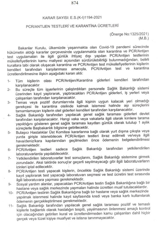 Bakanlar Kurulu, Covid-19 pandemi sürecinde hükümetin aldığı kararlar çerçevesinde uygulanmakta olan karantina ve PCR/Antijen test uygulamaları ile ilgili günlük ihtiyaç dışı yapılan PCR/Antijen testlerinin mükellefiyetlerinin kamu maliyesi açısından sürdürülebilirliği bulunmadığını belirtti.