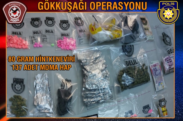 Polis Narkotik ve Kaçakçılığı Önleme Müdürlüğü ekipleri tarafından düzenlenen “Gökkuşağı Operasyonu” kapsamında, uyuşturucu olduğuna inanılan madde ve haplar ile nakit para ele geçirildi; yaşları 24 ile 32 arasında değişen 4 kişi ise tutuklandı.