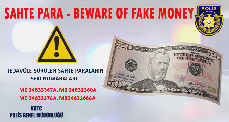 Polis, Girne’de sahte ABD doları banknotların tedavüle sürüldüğünü belirterek, vatandaşlara dikkatli olmaları, şüpheli kişileri polise bildirmeleri uyarısında bulundu.