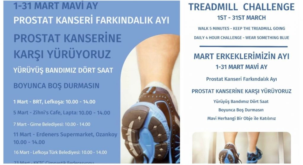 1-31 Mart tarihlerini kapsayan ‘Prostat Kanserine Karşı Yürüyoruz’ etkinliği yarın 10.00-14.00 saatleri arasında, Bayrak Radyo Televizyon Kurumu (BRTK) binasında yapılacak. Çalışanlar etkinliğe mavi renk objelerle katılırken, yürüyüş de gerçekleştirecek. Dernek temsilcileri ise, prostat kanserinin belirtileri konusunda bilgilendirici broşürler dağıtacak.
