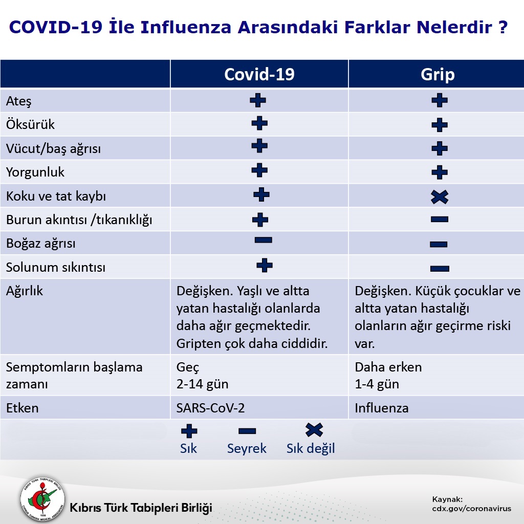 Kıbrıs Türk Tabipleri Birliği (KTTB), pandemi döneminde, ikisi de solunum yoluyla bulaştığı için, Covid-19 ile grip enfeksiyonlarının aynı anda bulaşma olasılığının çok yüksek olduğuna işaret ederek, sonuçları daha ağır olabileceği bu duruma karşı herkesin aşılarını düzenli yapması gerektiğini belirtti.
