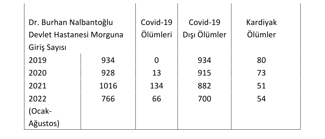 2022 yılının ilk 8 ayı verilerine göre ise, Dr. Burhan Nalbantoğlu Devlet Hastanesi Morgu’na 766 giriş yapıldı. 766 kişinin 66’sı Covid-19 nedeniyle hayatını kaybederken, diğer sebeplerden hayatını kaybeden 700 kişinin 54’ü kalp hastalığı nedeniyle oldu.