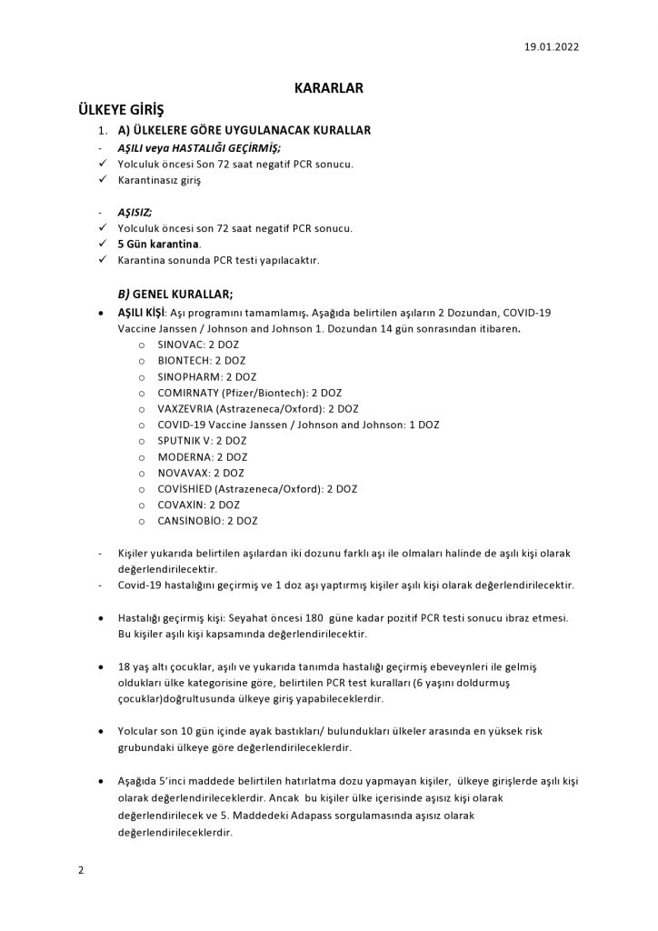 Bugün uygulamaya giren kurallara göre, sınır kapılarında aşılılardan 7 günlük PCR/antijen test, aşısızlardan ise 72 saatlik PCR test ya da 48 saatlik hızlı testi istenecek ancak aşılara getirilen “geçerlilik sürelerine” bağlı olarak 3. doz aşısını olmayan aşılılar, aşısız muamelesi görecek.