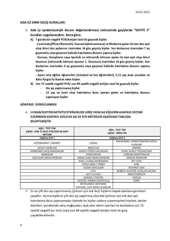 Ada içi epidemiyolojik durum değerlendirmesi neticesinde geçişlerde “Seviye 3” kurallarının uygulanmasına devam edilecek ancak aşıya göre değişen bazı uygulamalar getirdi.