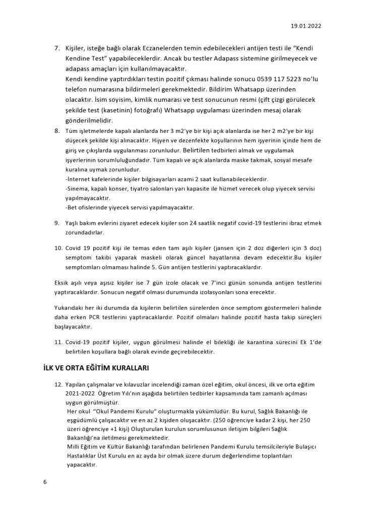 Okullarla ilgili öne çıkan bazı kararlara göre, okul öncesi öğrenciler için tarama testi zorunlu değil ancak bu öğrencilerle aynı evde yaşayan bir veliden aşılı olmaları halinde her 7 günde bir, aşısız olmaları halinde son 72 saatte bir antijen testi talep edilecek.