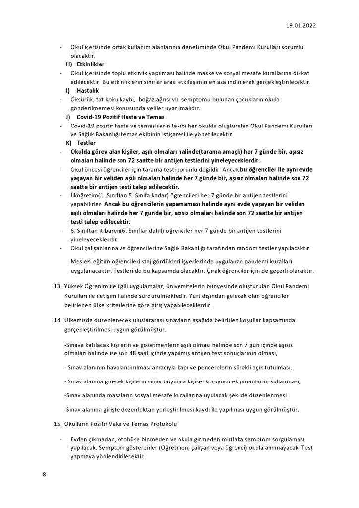 Okulda görev alan kişiler, aşılı olmaları halinde her 7 günde bir, aşısız olmaları halinde son 72 saatte bir antijen testlerini yineleyecek.