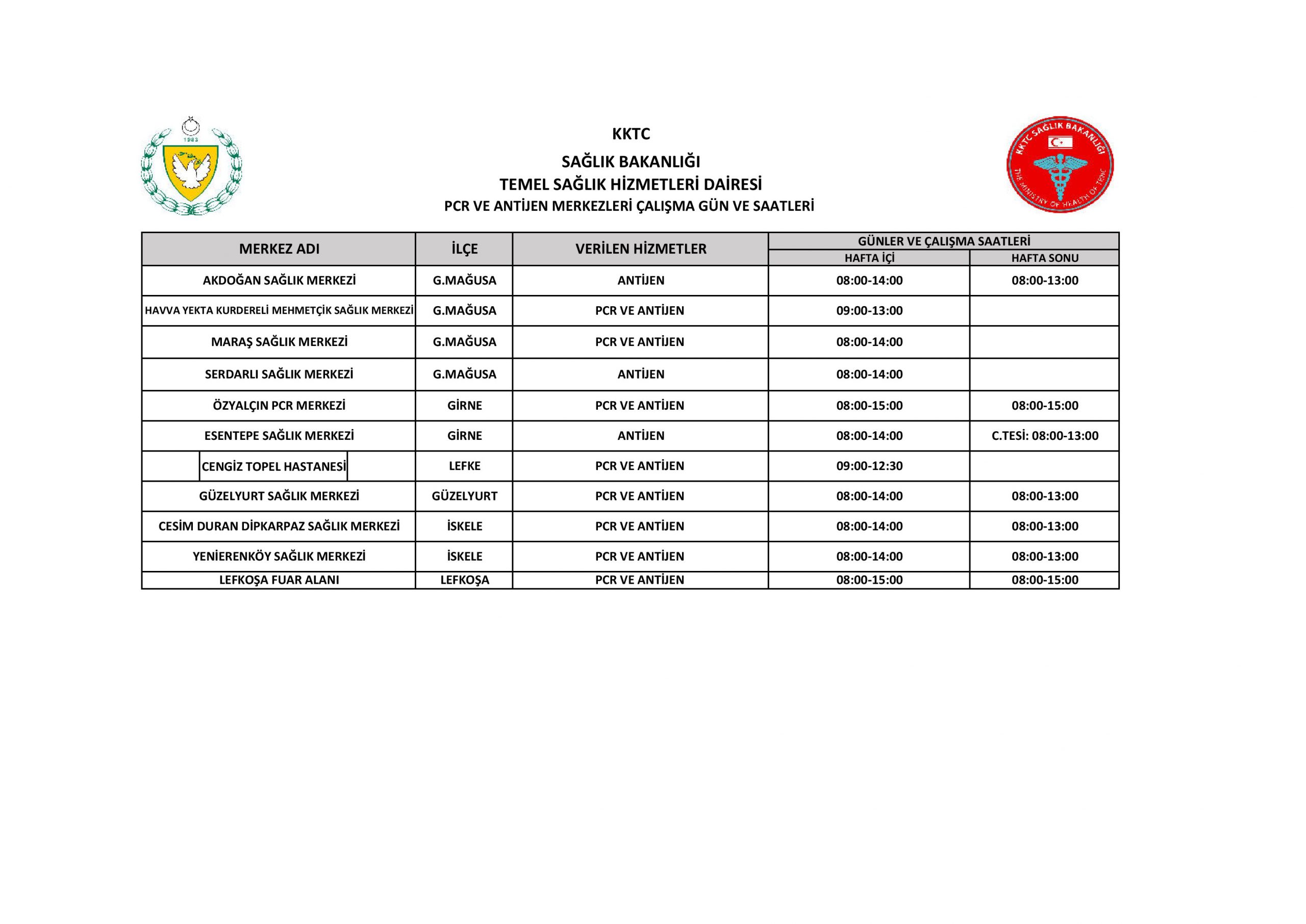 Gazimağusa İlçesi’nde bağlı Akdoğan Sağlık Merkezi’nde hafta içi 08:00-14:00; hafta sonu ise 08:00-13:00 saatleri arasında antijen testi; Havva Yekta Kurudereli Mehmetçik Sağlık Merkezi’nde hafta içi 09:00-13:00 saatleri arasında PCR ve antijen testi; Maraş Sağlık Merkezi’nde hafta içi 08:00-14:00 saatleri arasında PCR ve antijen; Serdarlı Sağlık Merkezi’nde hafta için 08:00-14:00 saatleri arasında antijen testi yaptırılabilir.