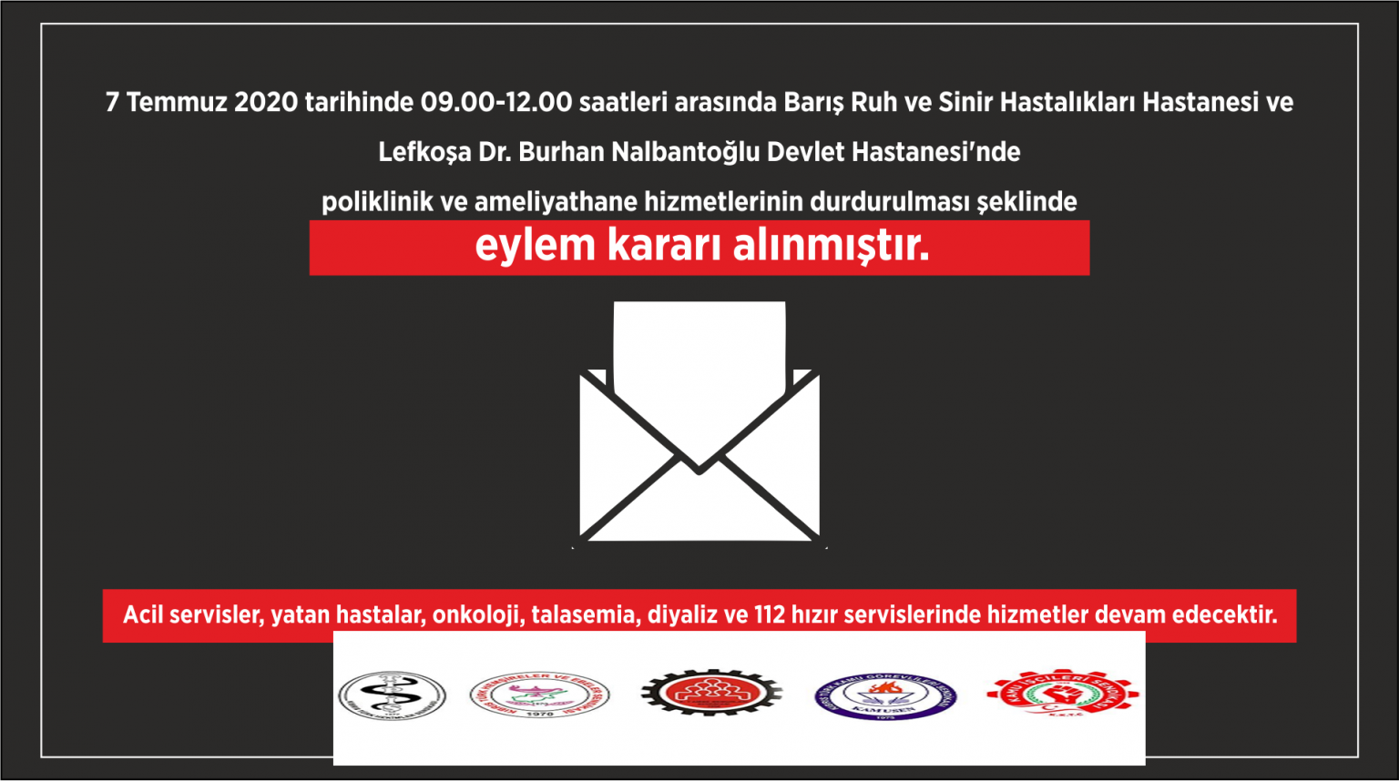 “Sağlıkta örgütlü sendika yönetim kurulları olarak bugün yaptığımız toplantıda çeşitli kereler gündeme getirdiğimiz sorunlar ve son olarak 2 Temmuz 2020 tarihinde bir kez daha uyardığımız hükümetin eksikliklerin giderilmesiyle ilgili herhangi bir adım atılmaması nedeniyle 7 Temmuz 2020 tarihinde 09.00-12.00 saatleri arasında Barış Ruh ve Sinir Hastalıkları Hastanesi ve Lefkoşa Dr. Burhan Nalbantoğlu Devlet Hastanesi’nde poliklinik ve ameliyathane hizmetlerinin durdurulması şeklinde eylem kararı alınmıştır.