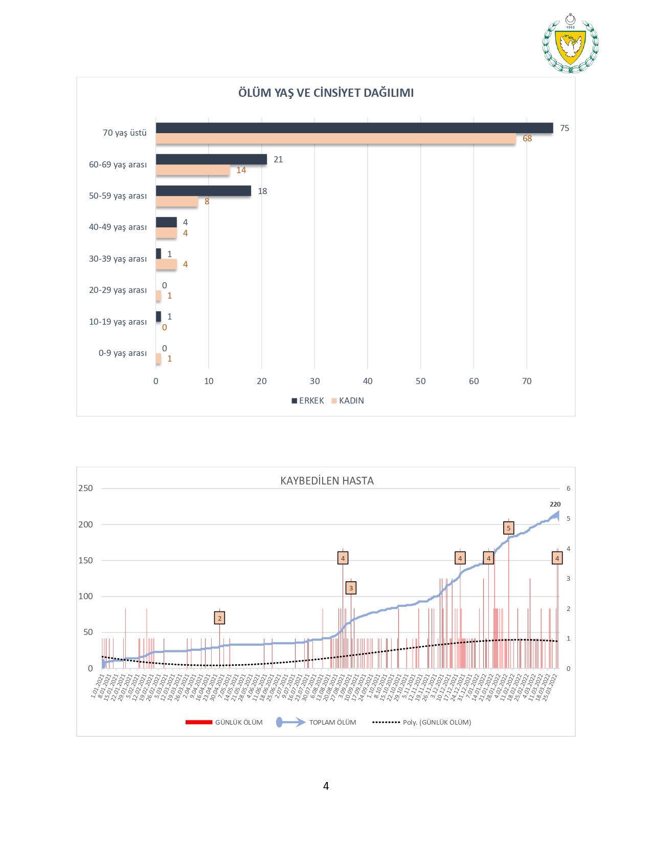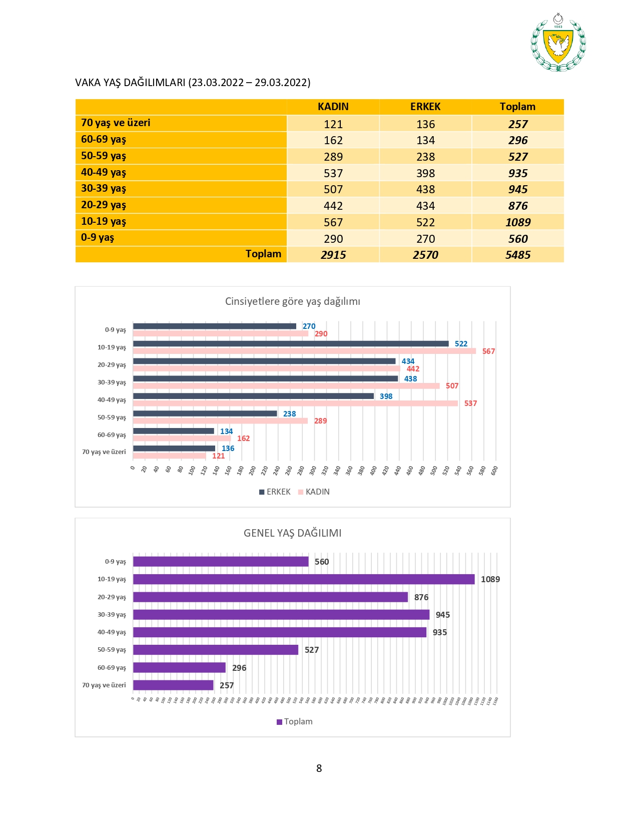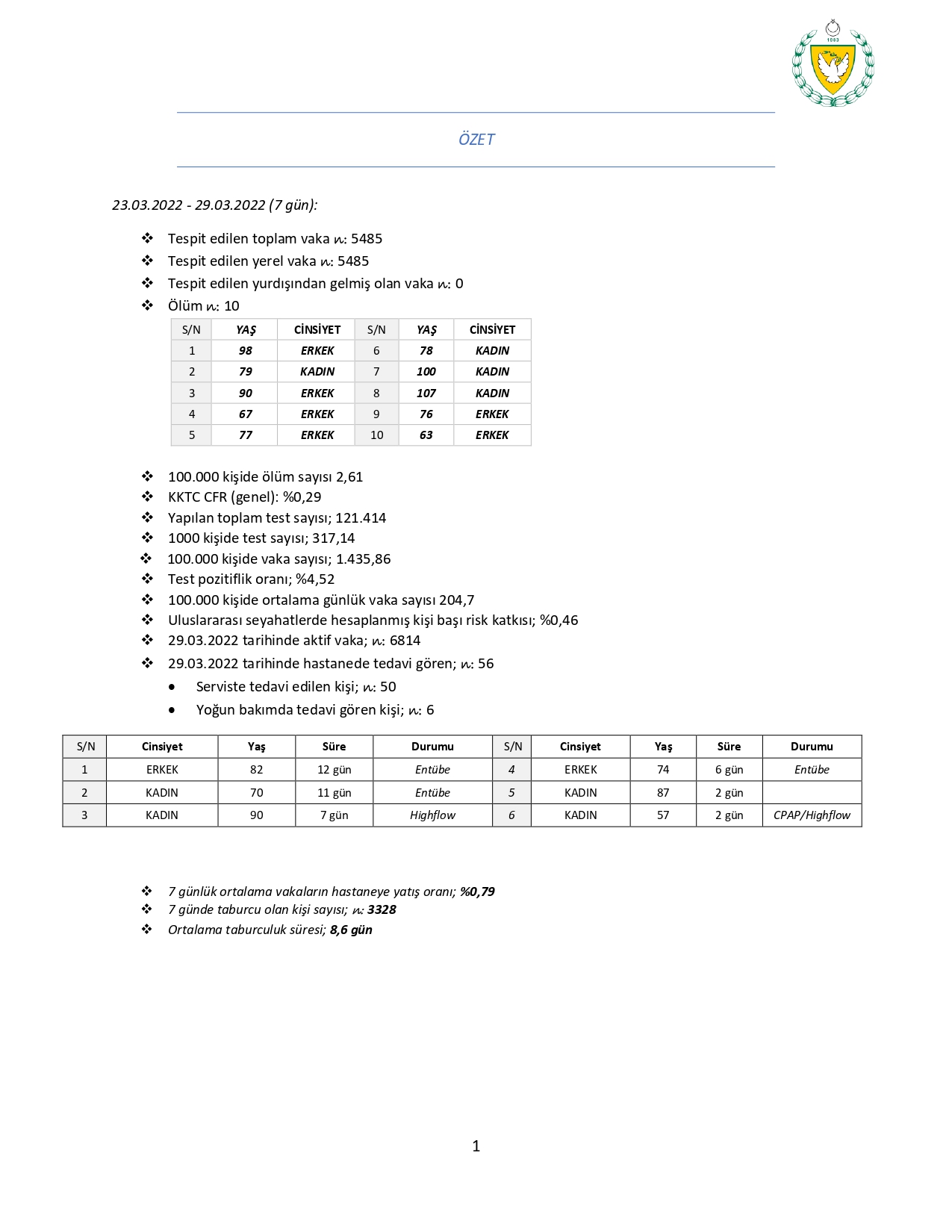 Rapora göre, 23 Mart ile 29 Mart tarihlerini kapsayan 7 günlük süreçte KKTC genelinde 5 bin 485 vaka tespit edildi, 10 kişi ise covid-19 nedeniyle hayatını kaybetti. 16 Mart ile 22 Mart tarihlerini kapsayan haftada 4 bin 11 olan toplam vaka sayısında %36.75; 5 olan kaybedilen vaka sayısında ise %100 oranında artış gözlemlendi. Rapora göre, bir haftada yaşları 63 ile 107 arasında değişen 6 erkek ile 4 kadın hasta hayatını kaybetti.