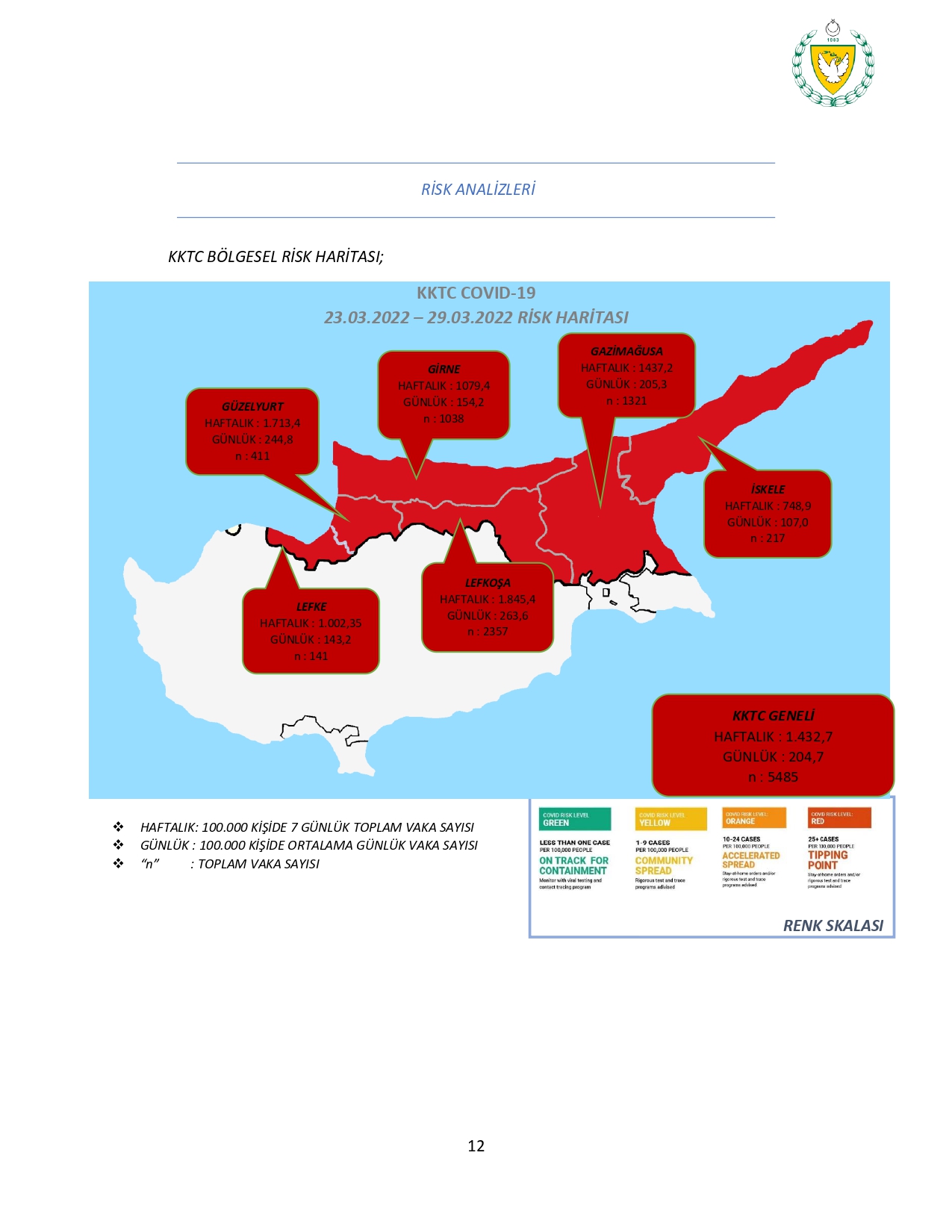 Sağlık Bakanlığı Bulaşıcı Hastalıklar Üst Komitesi nezdinde hazırlanan ve 23 – 29 Mart tarihleri arasındaki dönemi kapsayan “Covid-19 Haftalık Salgın Raporu”na göre, vaka ve ölüm sayısı, test pozitiflik oranı ve virüs bulaştırma katsayısını yani bir kişinin virüsü bulaştıracağı kişi sayısını gösteren R değeri zirveyi gördü. KKTC risk haritasında ise tüm bölgeler, “Tipping Point” (kritik) olarak değerlendirilen “kırmızı” rengiyle gösteriliyor.