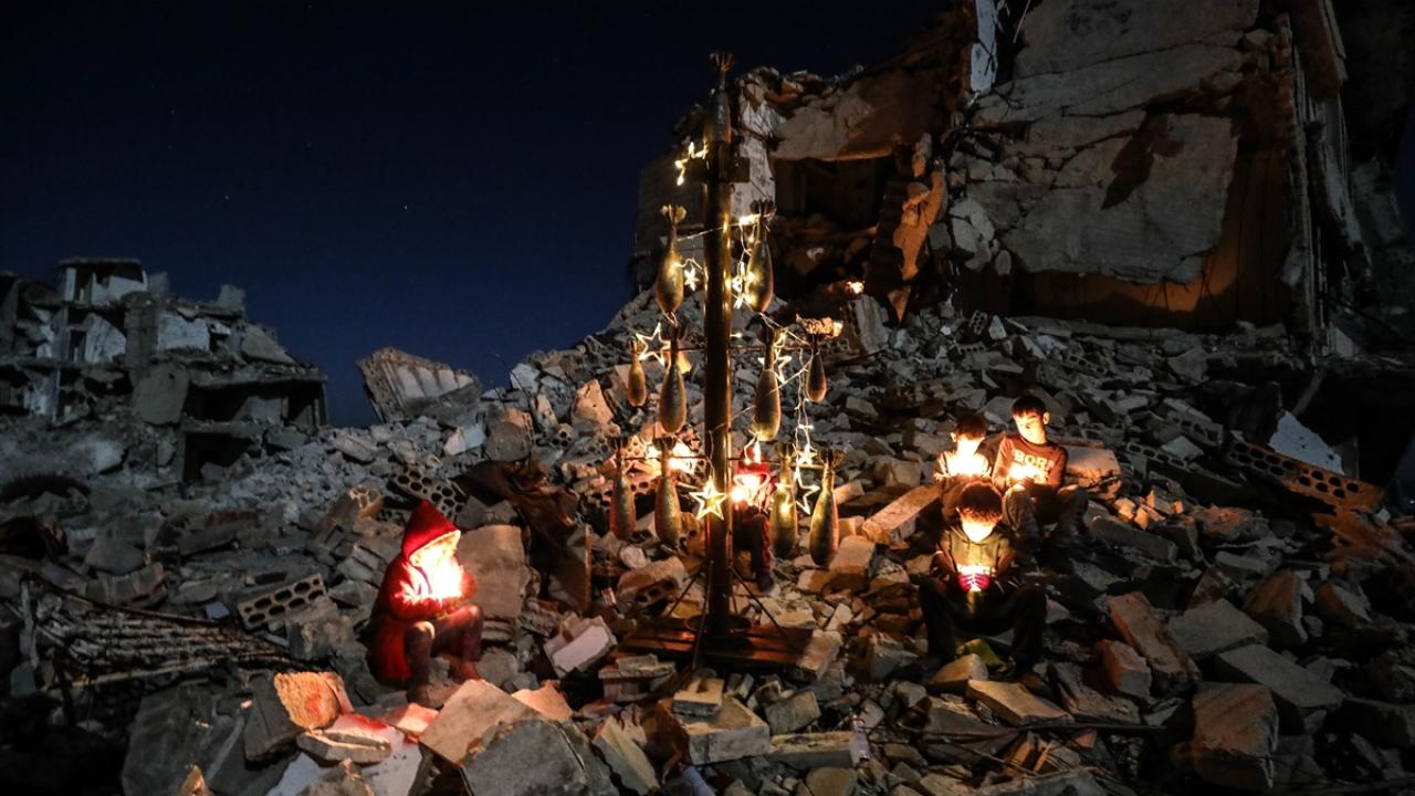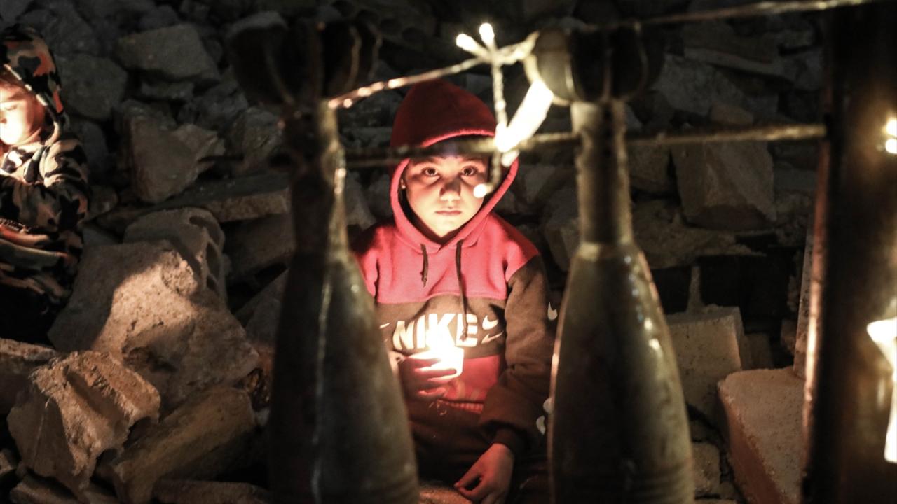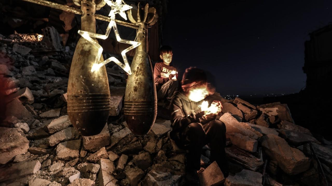 Yeni yıla umutla girmek isteyen Suriyeli çocuklar, savaşın getirdiği yıkıma dikkat çekmek için İdlib’te yıkılan bir evin enkazında patlamış havan ve mühimmat kalıntılarını aydınlattı.