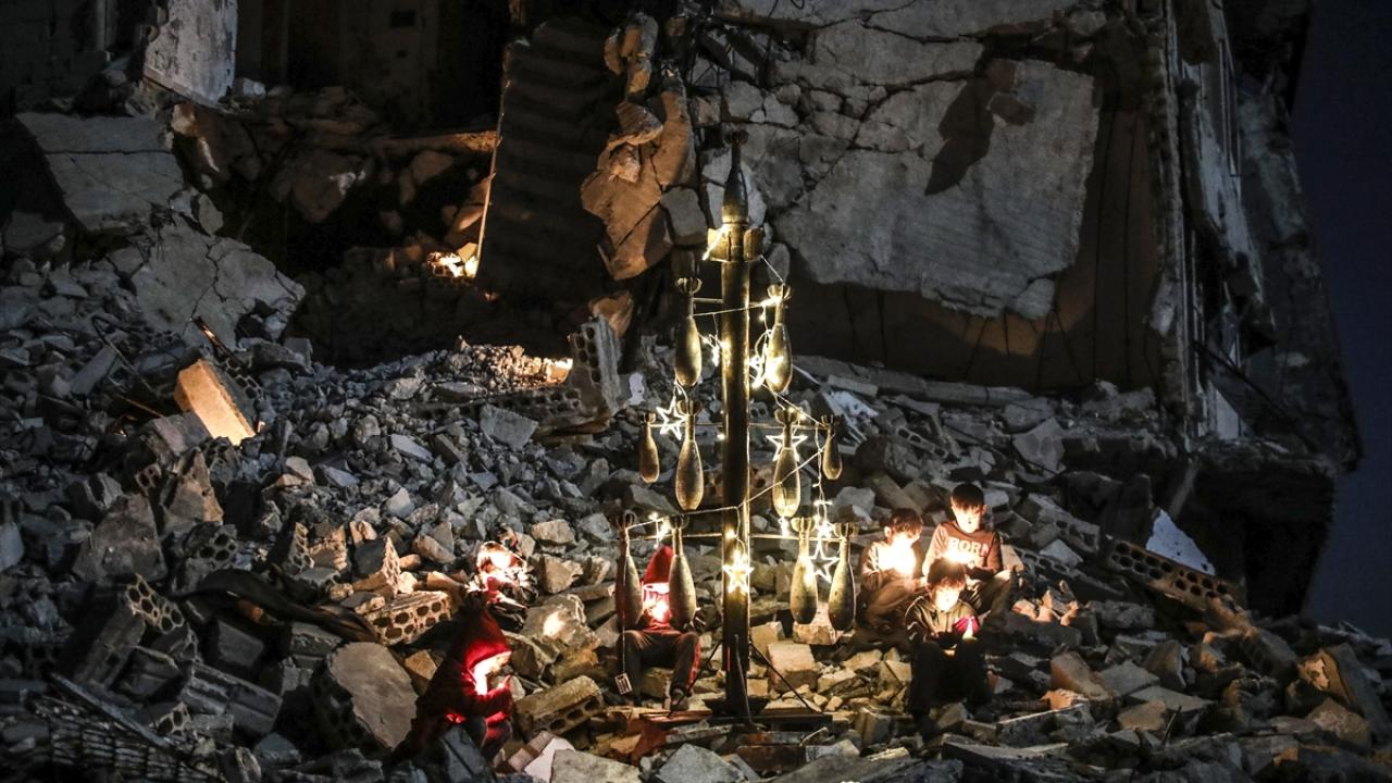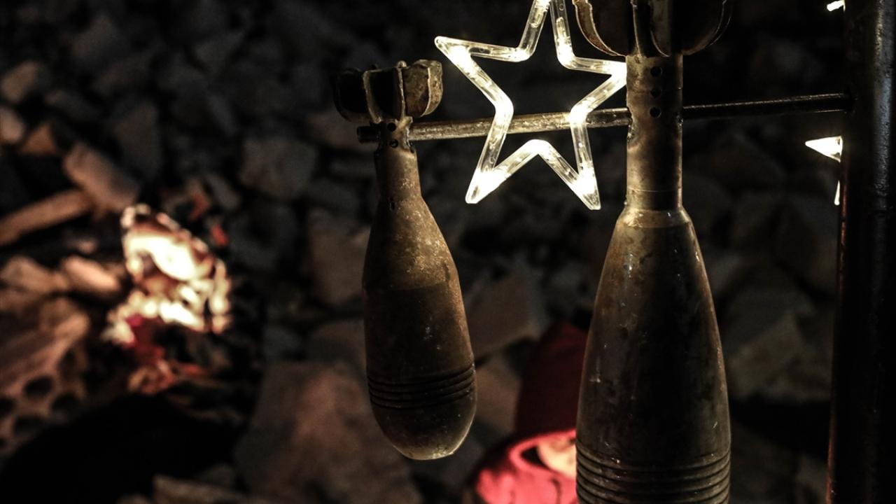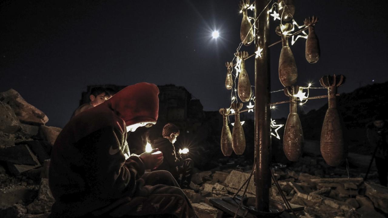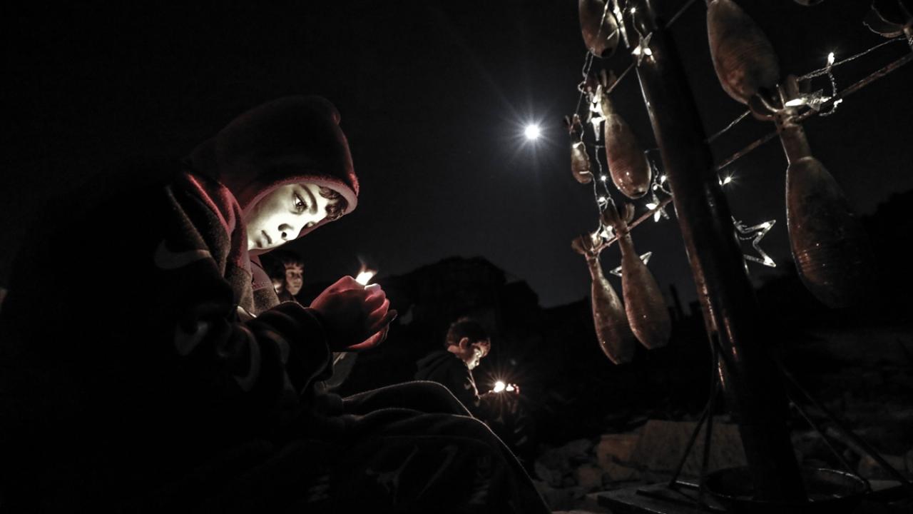 Yeni yıla umutla girmek isteyen Suriyeli çocuklar, savaşın getirdiği yıkıma dikkat çekmek için İdlib’te yıkılan bir evin enkazında patlamış havan ve mühimmat kalıntılarını aydınlattı.