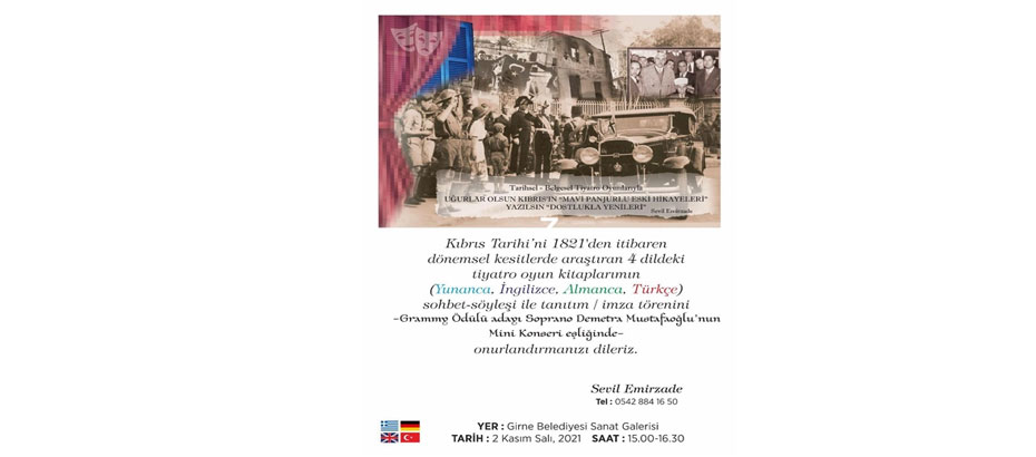 Yazar Sevil Emirzade, ilki 11 Ekim’de Büyük Han’da yer alan 4 dildeki ‘Tarihsel ve Belgesel oyun kitabının tanıtım etkinliği, bu kez de 2 ve 9 Kasım Salı günü, saat 15.00’te Girne Belediyesi Sanat Galerisi’nde Girneli okurlar için düzenlenleyecek.