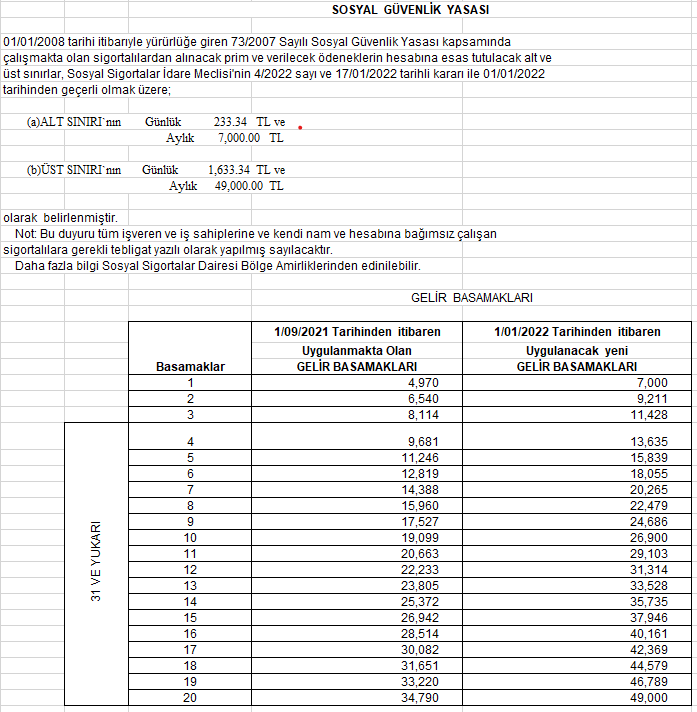 Bakanlar Kurulu’nun 19 Ocak tarihli kararı doğrultusunda 1 Ocak tarihinden geçerli olmak üzere alt sınır günlük 233.34 TL ve aylık 7 bin TL, üst sınır günlük bin 633 TL 34 kuruş ve aylık 49 bin TL olarak yeniden belirlendi.