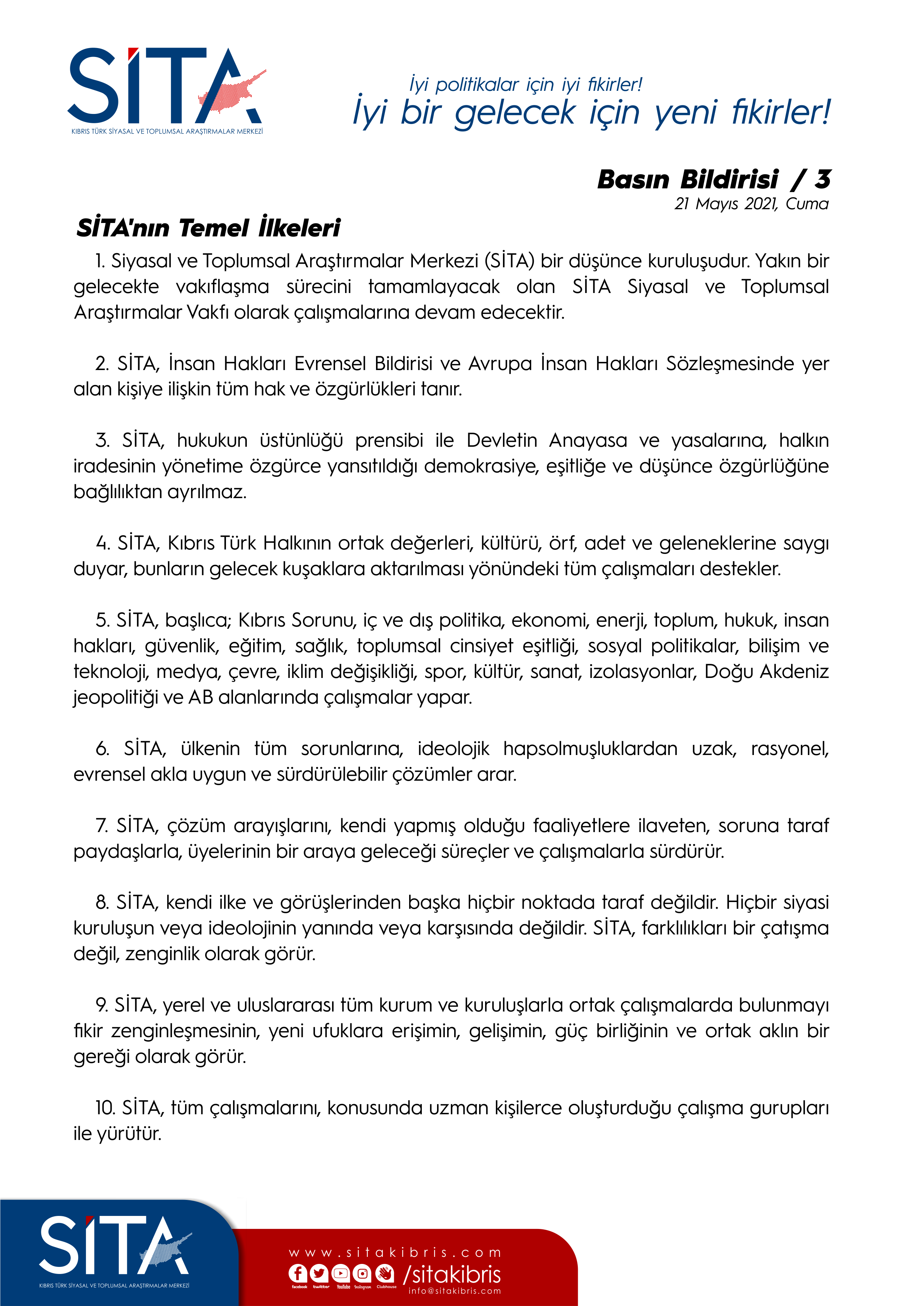 1. Kıbrıs Türk Siyasal ve Toplumsal Araştırmalar Merkezi (SİTA) bir düşünce kuruluşudur. Yakın bir gelecekte vakıflaşma sürecini tamamlayacak olan SİTA Kıbrıs Türk Siyasal ve Toplumsal Araştırmalar Vakfı olarak çalışmalarına devam edecektir.