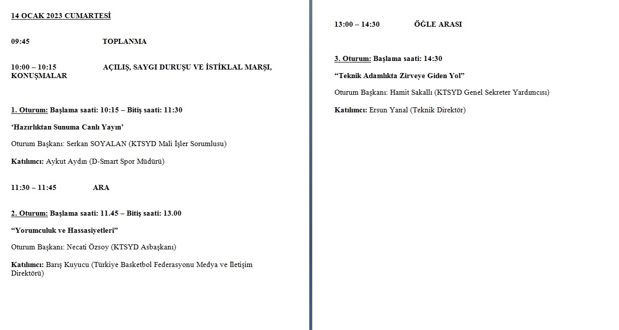 KTSYD Yönetim Kurulu üyesi Serkan Soyalan’ın oturum başkanlığı yapacağı ilk oturum saat 10.15’te başlayacak. “Hazırlıktan Sunuma Canlı Yayın” konu başlığı D-SMART Spor Müdürü Aykut Aydın tarafından üyelere aktarılacak.
