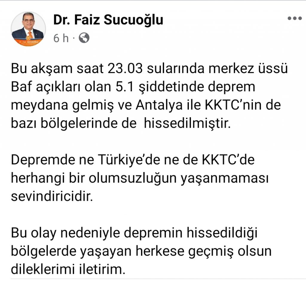 Sucuoğlu yaptığı paylaşımda, “Bu akşam saat 23.03 sularında merkez üssü Baf açıkları olan 5.1 şiddetinde deprem meydana gelmiş ve Antalya ile KKTC’nin de bazı bölgelerinde de hissedilmiştir.
