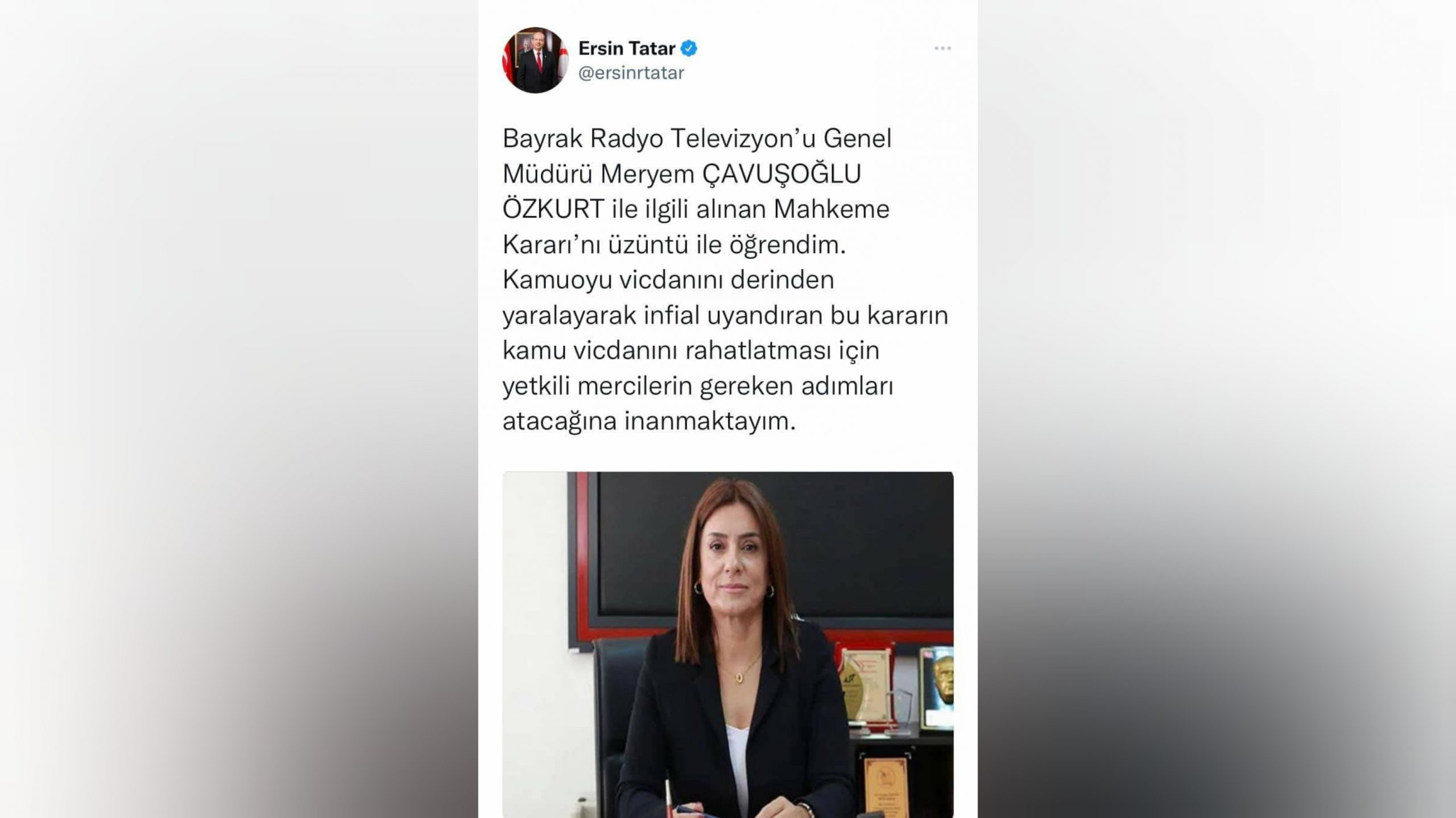 “Bayrak Radyo Televizyon Kurumu Genel Müdürü Sn. Meryem ÇAVUŞOĞLU ÖZKURT ile ilgili bugün alınan Mahkeme Kararı’nı büyük bir üzüntü ile öğrenmiş bulunmaktayım. Kamuoyu vicdanını derinden yaralayarak infial uyandırdığını gözlemlediğim bu konuda, kamu vicdanının rahatlatılması için yetkili mercilerin gereken adımları ivedilikle atacağına inanmaktayım”