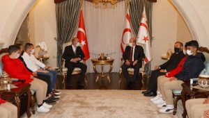 Cumhurbaşkanı Ersin Tatar, Lefkoşa Türk Lisesi Müdürü Niyazi Türkseven, beden eğitimi öğretmenleri ve okulun kız-erkek futsal takımını kabul ederek görüştü…Okulun bu zamana kadar birçok değeri yetiştirdiğini dile getiren Cumhurbaşkanı Tatar, futsal takımını göstermiş olduğu başarılardan dolayı da kutladı…Lefkoşa Türk Lisesi Müdürü Niyazi Türkseven ise Cumhurbaşkanı Tatar’a şampiyonaya katkılarından dolayı teşekkür etti.