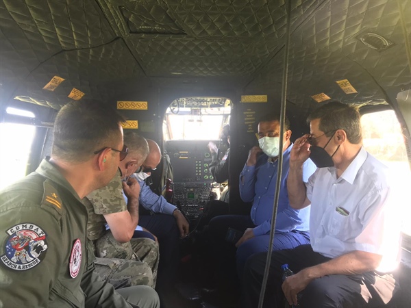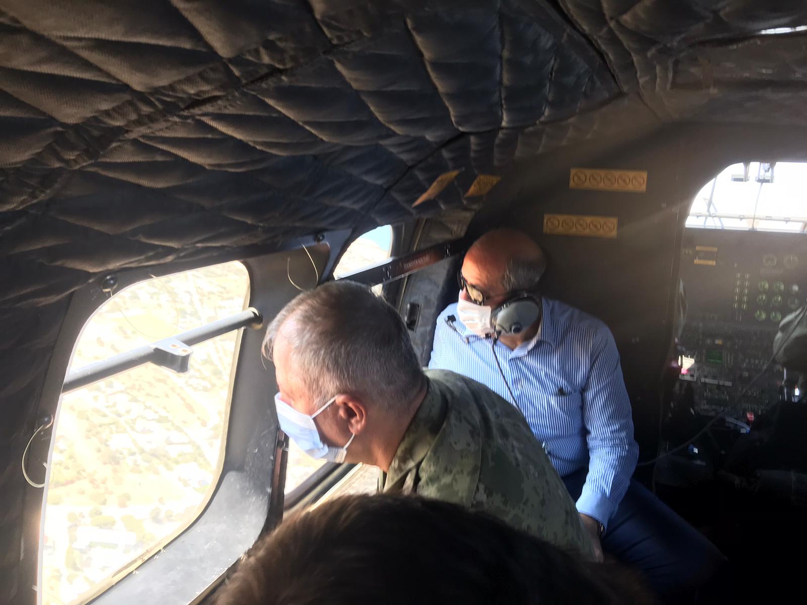 Karşıyaka köyünün güney batı kısmındaki ormanlık alandaki yangının kontrol altına alınmasının ardından bölgede bulunan Cumhurbaşkanı Ersin Tatar, Başbakan Ersan Saner, Güvenlik Kuvvetleri Komutanı Tümgeneral Zorlu Topaloğlu ve Dışişleri Bakanı Tahsin Ertuğruloğlu’nun yangın bölgesini helikopterle havadan inceliyor.