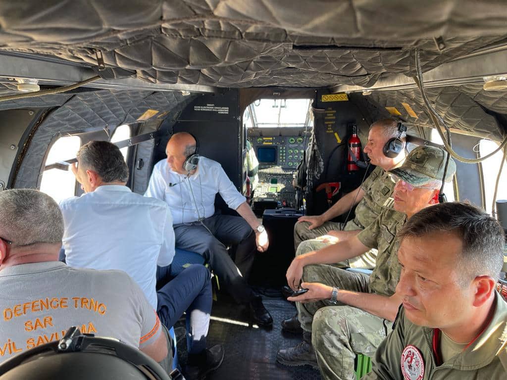 Cumhurbaşkanı Tatar Tarım ayrıca ve Doğal Kaynaklar Bakanı Dursun Oğuz ile birlikte havadan yangın bölgesini inceledi.