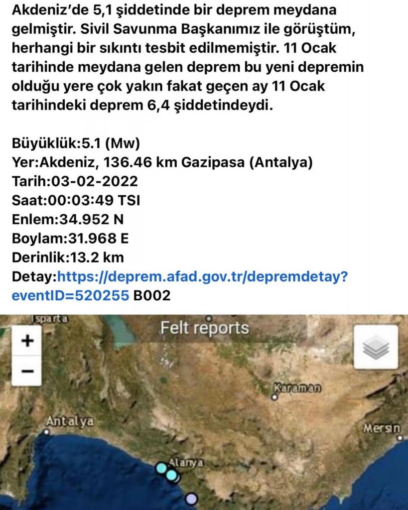 Cumhurbaşkanı Tatar, paylaşımında “Akdeniz’de 5,1 şiddetinde bir deprem meydana gelmiştir. Sivil Savunma Başkanımız ile görüştüm, herhangi bir sıkıntı tespit edilmemiştir. 11 Ocak tarihinde meydana gelen deprem bu yeni depremin olduğu yere çok yakın fakat geçen ay 11 Ocak tarihindeki deprem 6,4 şiddetindeydi.” dedi.