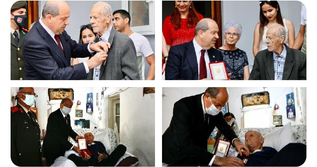 Cumhurbaşkanı Ersin Tatar, Güvenlik Kuvvetleri Komutanı Tümgeneral Zorlu Topaloğlu ve Kıbrıs TMT Mücahitler Derneği Başkanı Yılmaz Bora ile birlikte Kıbrıs Türk halkının milli mücadelesine yapmış oldukları üstün hizmetler nedeniyle Görneç ve Gazimağusa bölgesinde ikamet eden ve sağlık problemi yaşayan gazileri ziyaret ederek şeref madalyası takdim etti.