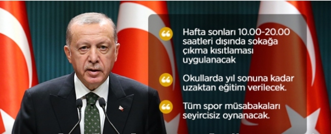 Erdoğan, “Hafta sonları tedarik ve üretim zincirleri aksamayacak şekilde 10.00 ile 20.00 saatleri arası dışında sokağa çıkma sınırlaması uygulanacak.” dedi.