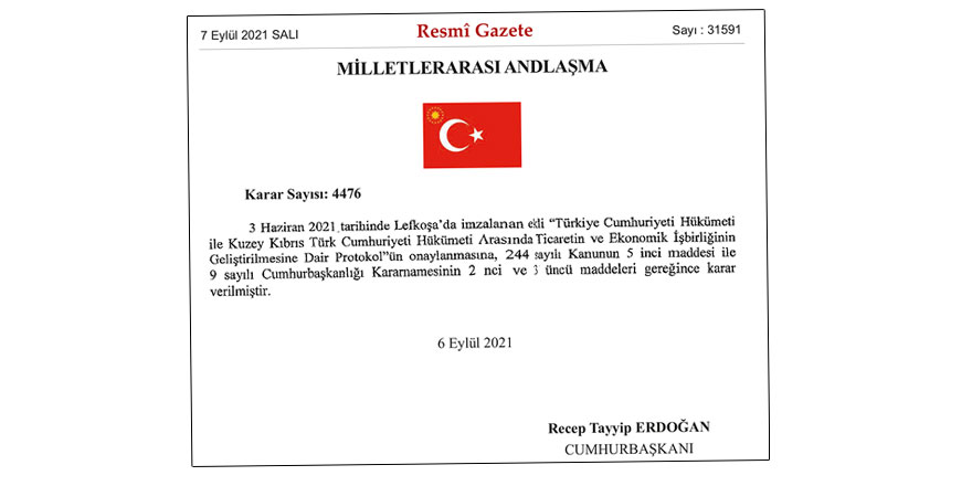 Türkiye ile Kuzey Kıbrıs Türk Cumhuriyeti arasında ticaretin ve ekonomik iş birliğinin geliştirilmesine yönelik protokolün onaylanmasına ilişkin karar, Resmi Gazete’de yayımlandı.
