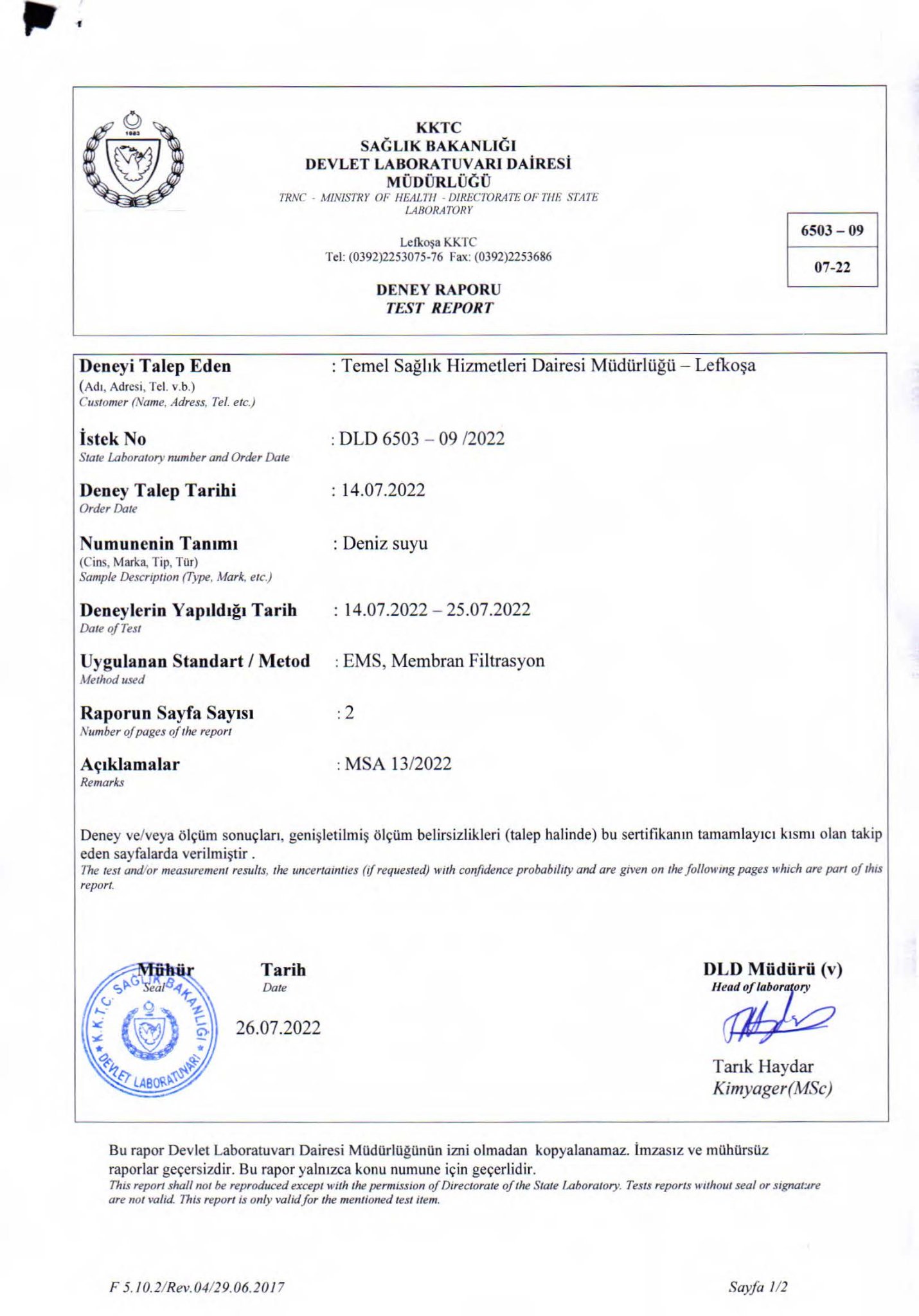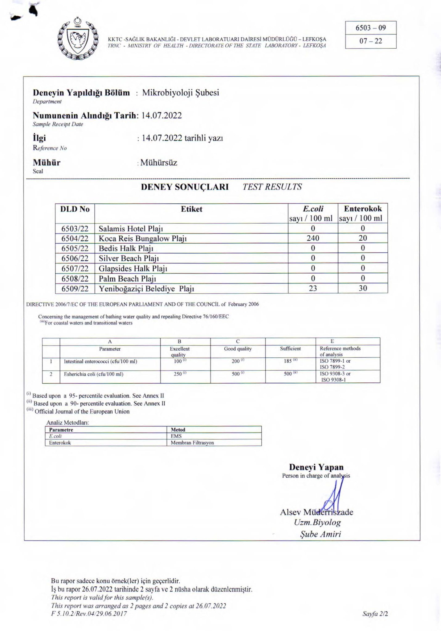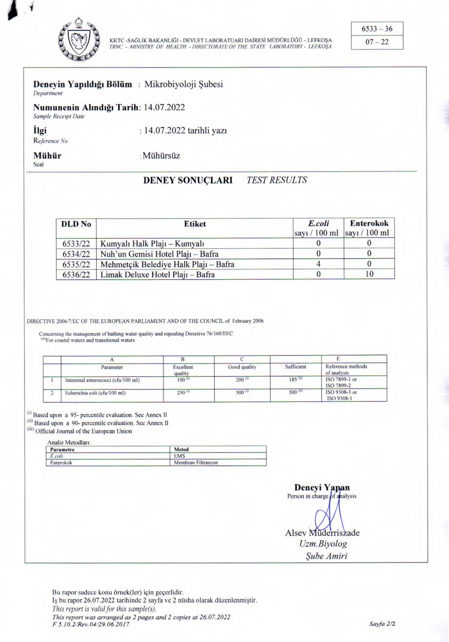 Sağlık Bakanlığı’na bağlı Temel Sağlık Hizmetleri Dairesi tarafından, Devlet Laboratuvarı’nda gerçekleştirilen Temmuz ayına ait deniz suyu analiz raporları ekte yer aldığı şekildedir.