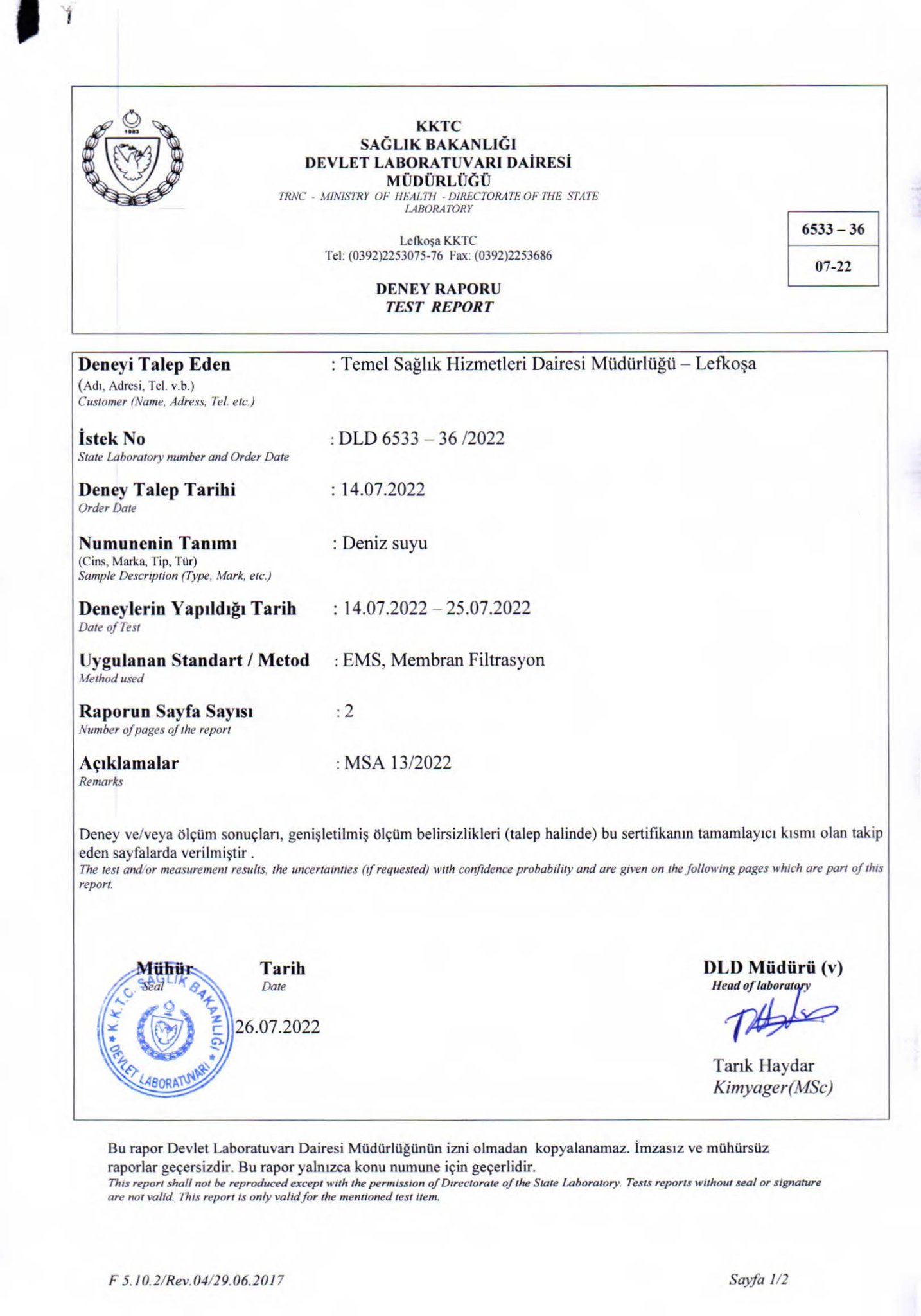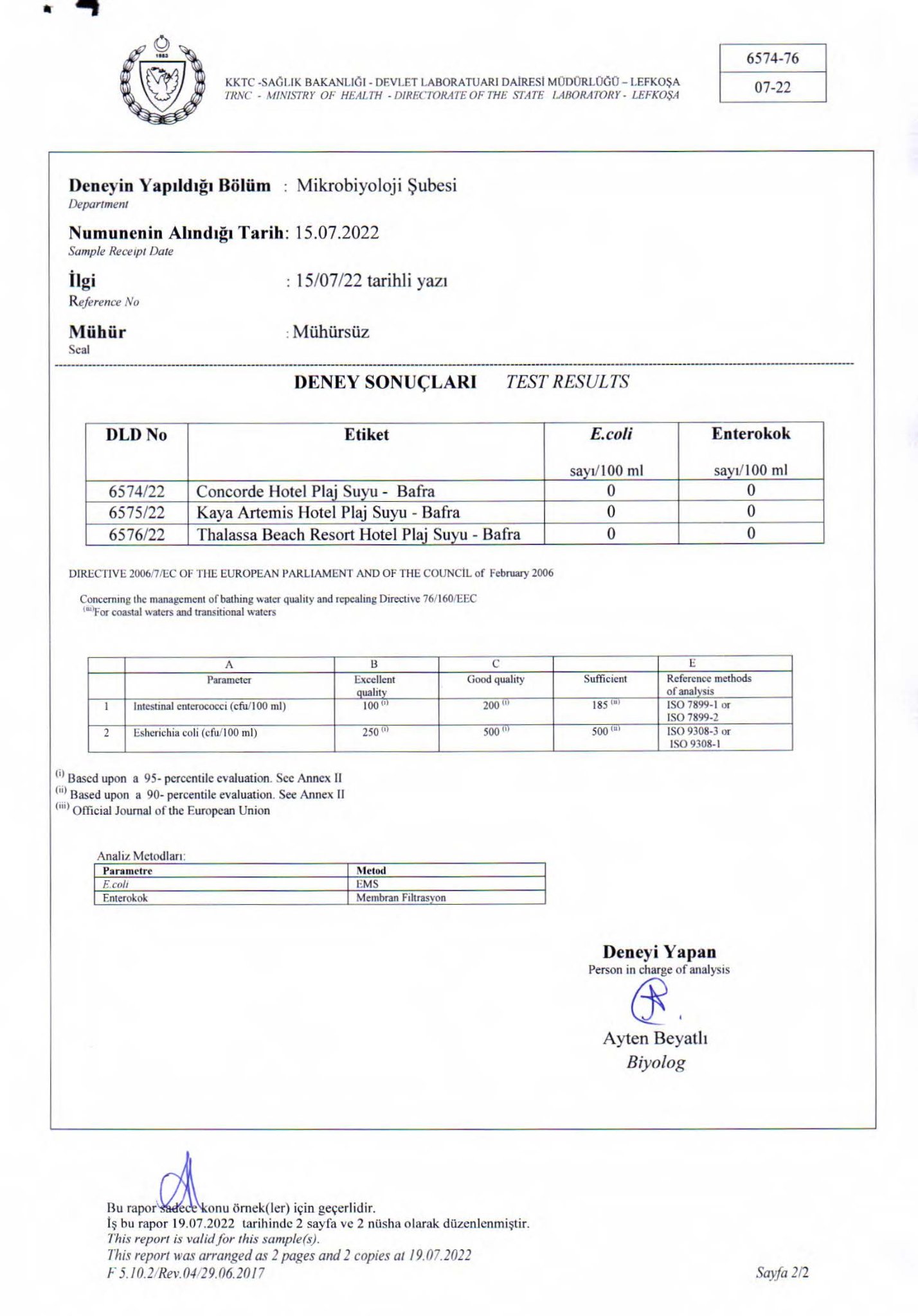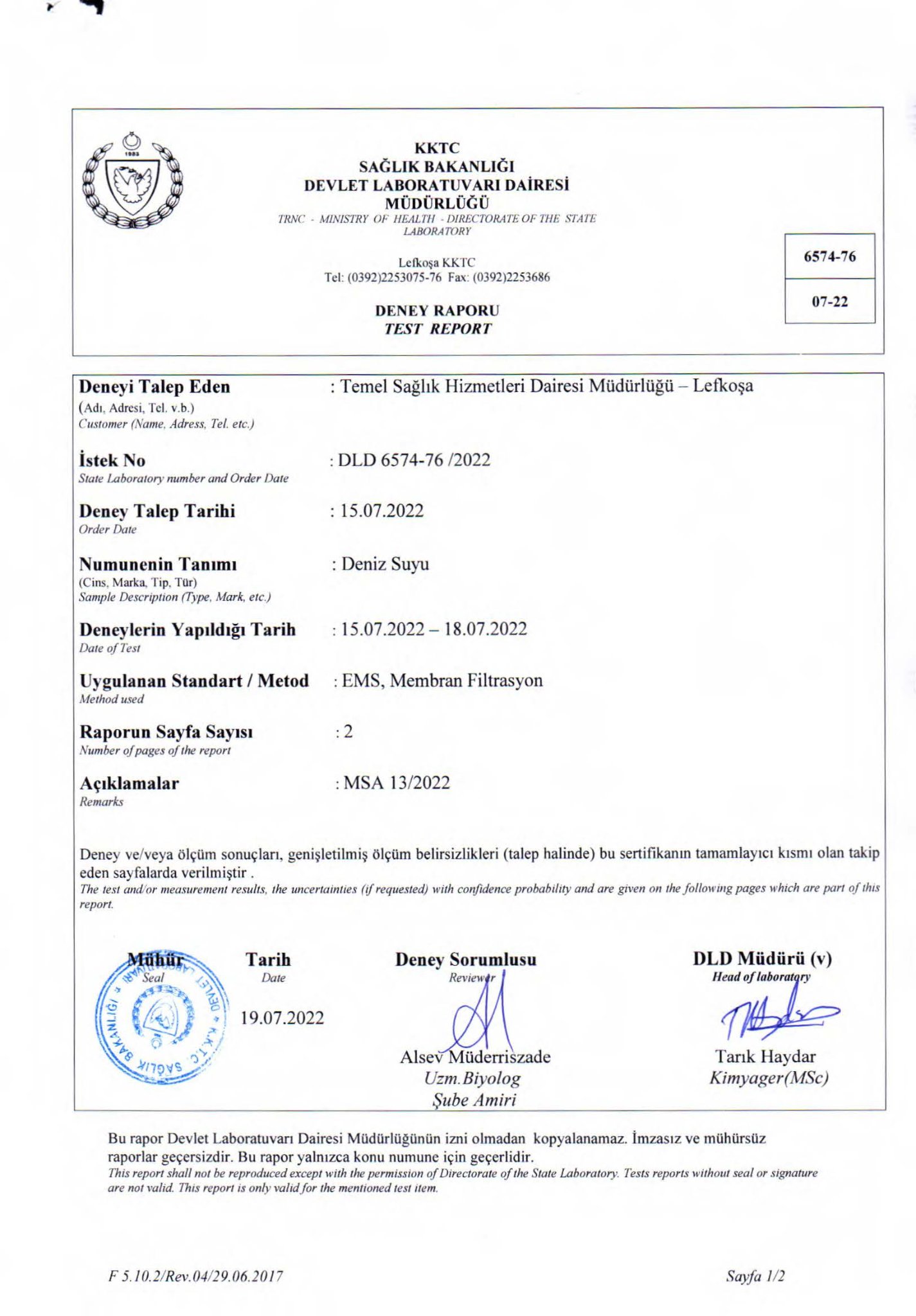 Sağlık Bakanlığı’na bağlı Temel Sağlık Hizmetleri Dairesi tarafından, Devlet Laboratuvarı’nda gerçekleştirilen Temmuz ayına ait deniz suyu analiz raporları ekte yer aldığı şekildedir.
