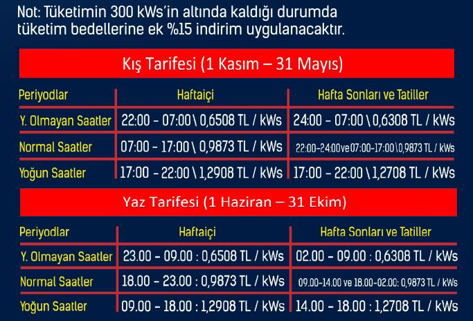 On weekends and holidays, off-peak hours are 02.00-07.00: 0.6308 TL / kWh, Normal hours 22.00-24.00 and 07.00-17.00: 0.9873 TL / kWh,