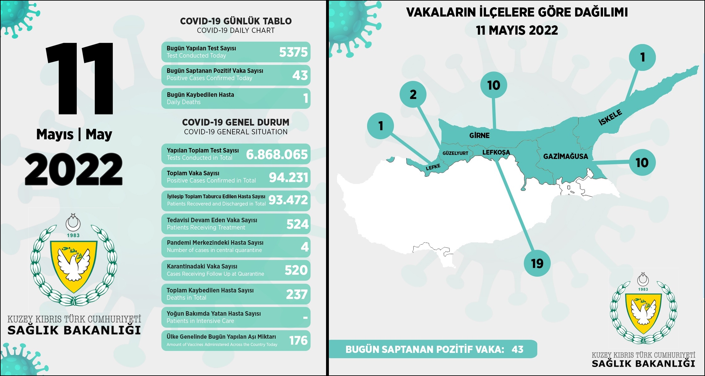 KKTC‘de son 24 saatte yapılan test sayısı 5375 olup, 1 kişi vefat etmiş, 43 pozitif vakaya rastlanmıştır.