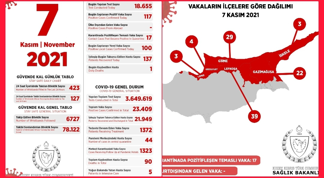 39 of the cases are from the Lefkoşa District, 29 from the Girne District, 22 from the Gazimağusa District, three from the İskele District, four from the Güzelyurt District and three from the Lefke District.