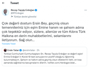 Bugün, eşi Emine Erdoğan ile Covid-19 testleinin pozitif çıktığını açıklayan Erdoğan, sosyal medya paylaşımında “Çok değerli dostum Ersin Bey, geçmiş olsun temennileriniz için eşim Emine hanım ve şahsım adına çok teşekkür ediyor, sizlere, ailenize ve tüm Kıbrıs Türk Halkına en derin muhabbetlerimi, selamlarımı iletiyorum. Sağ olun…” ifadelerini kullandı.