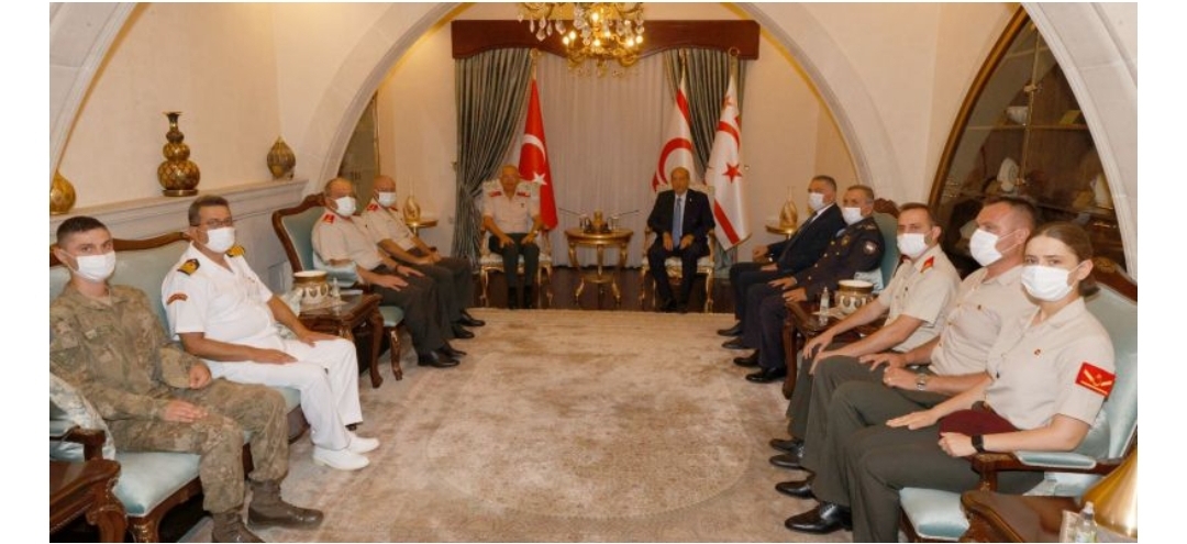 Cumhurbaşkanı Tatar Kıbrıs’ın fethinin 451.,TMT’nin 64. ve GKK’nın 46. kuruluş yıl dönümü dolayısıyla GKK Komutanı Tümgeneral Zorlu Topaloğlu, GKK Komutan Yardımcısı Albay Kadir Bayraklı, Polis Genel Müdürü Vekili Hüseyin Sağıroğlu ve GKK personelini kabul etti.